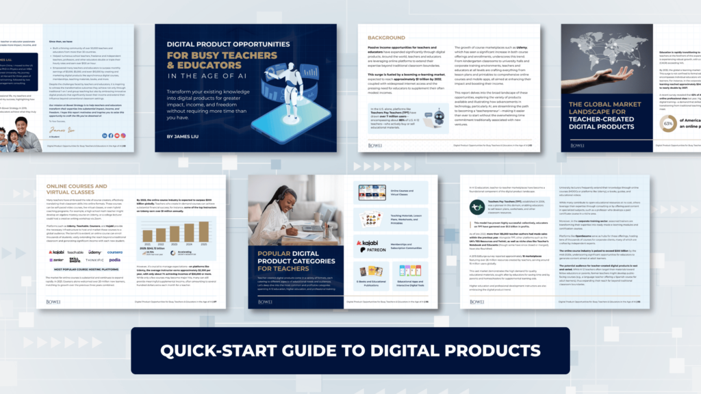This is a free guide for busy teachers & educators who have knowledge but no time. Request it if you want to turn your existing knowledge into digital products and passive income with new technologies like AI.